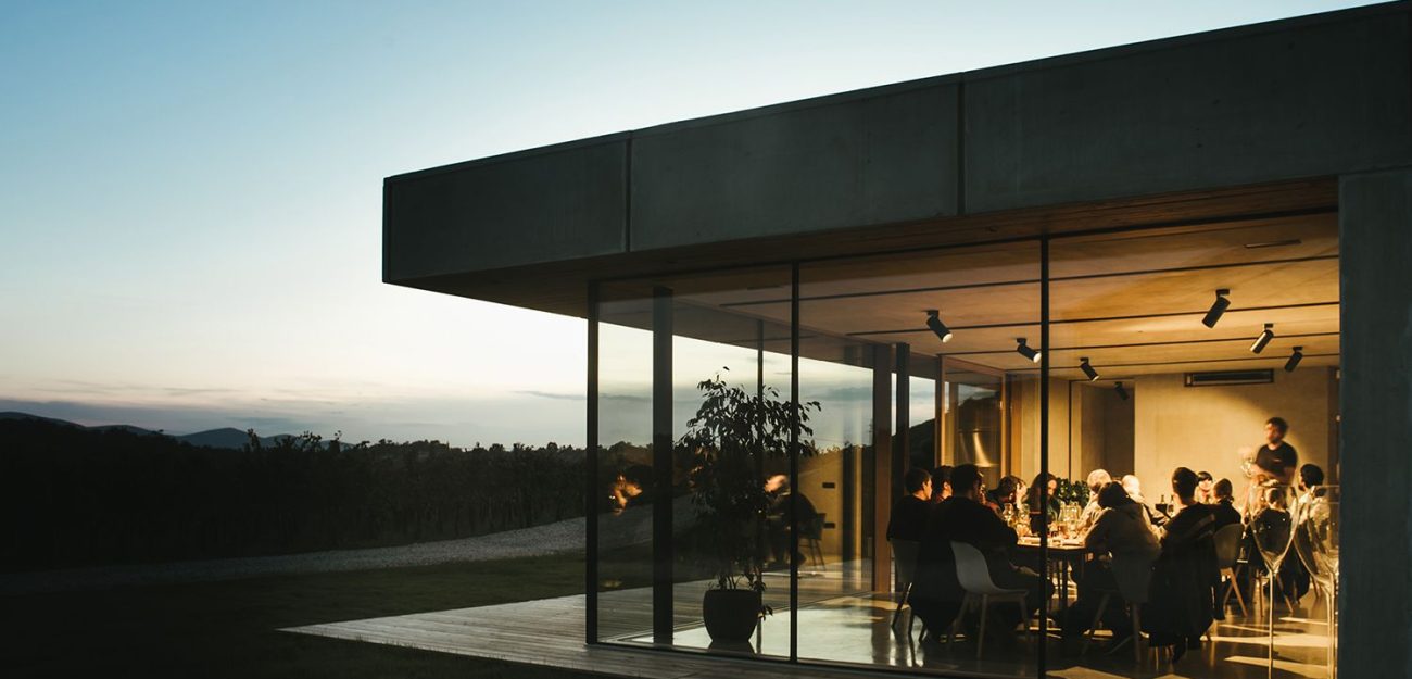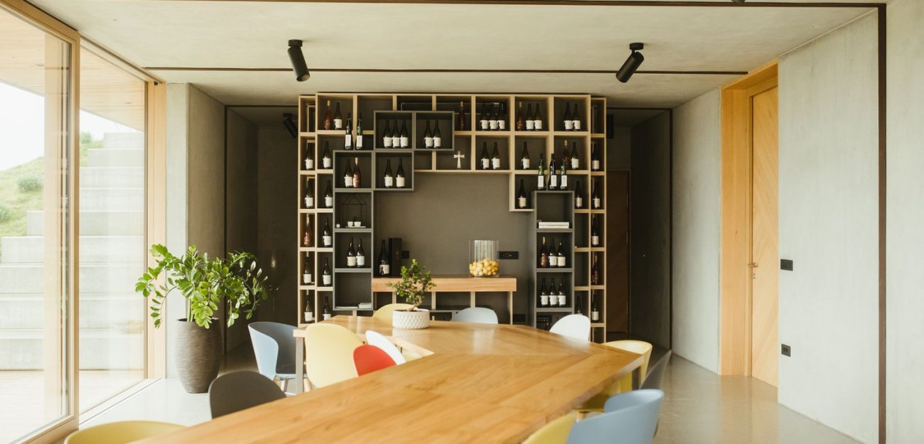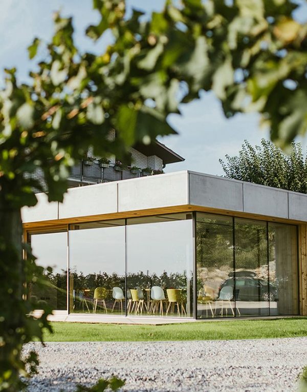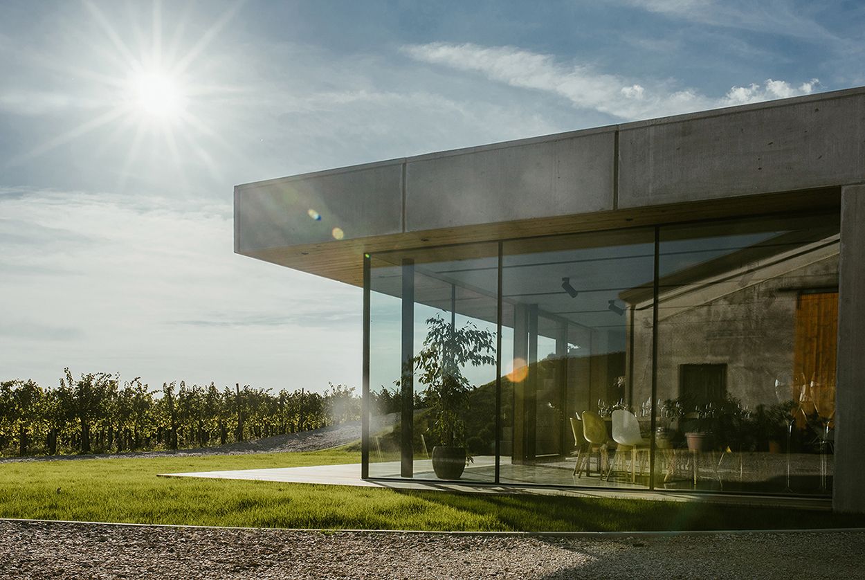 Les architectes ont été chargés de concevoir une salle de dégustation séparée, où les invités peuvent profiter d’une présentation authentique des jeunes vignerons de Vipava. Outre le vin et la nourriture, l’espace nouvellement conçu offre également des vues attrayantes sur la vallée, qui complètent l’expérience du visiteur. Le bâtiment, de forme rectangulaire, présente des lignes épurées. Grâce à un grand mur d’angle en verre et à une terrasse couverte, l’intérieur se fond de manière fluide dans l’extérieur. L’enveloppe de verre est entourée d’une structure visible en béton, tandis que le bardage en bois à l’intérieur du bâtiment apporte chaleur et convivialité. (Foto: Nejc Bole)