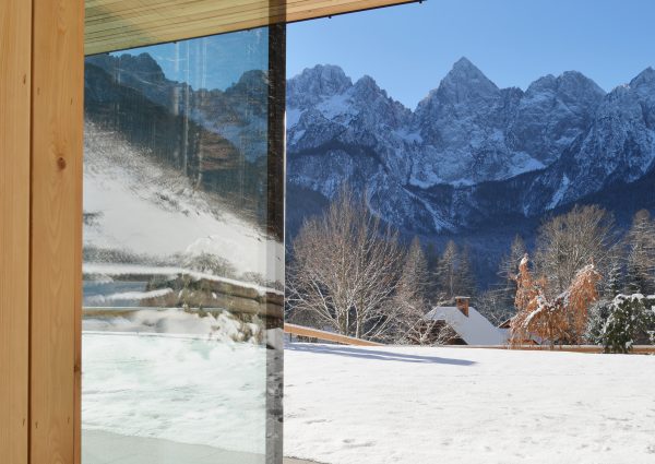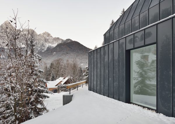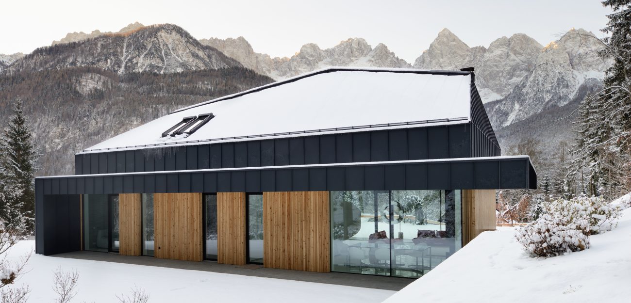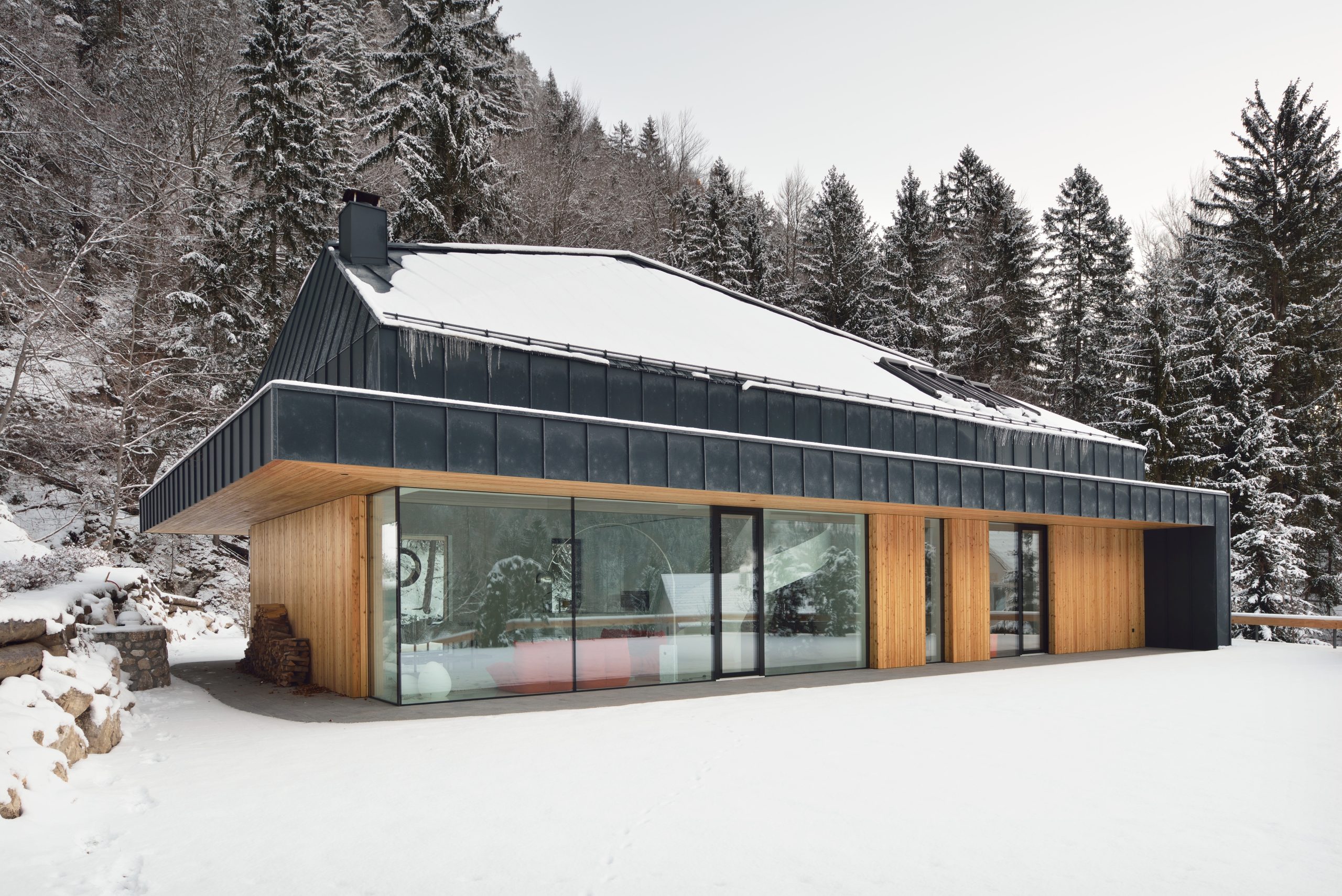 Une maison de vacances à la lisière de la forêt, où les propriétaires souhaitaient que l’on puisse sentir le pouls de la nature environnante en toute saison. De grandes surfaces vitrées ont été utilisées à cet effet.