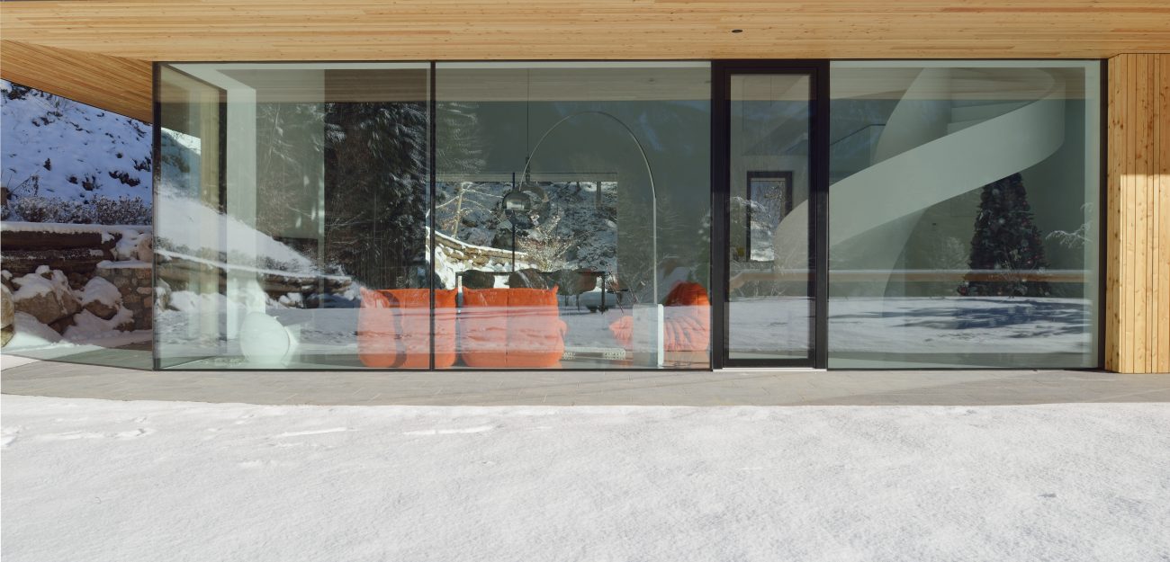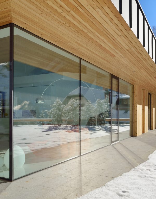 Fenêtre pour architectures modernes avec façade vitrée : le bois est dissimulé derrière un vitrage isolant à bord émaillé, donnant à la façade une apparence minimaliste et pure. À l’intérieur, le bois chaud et travaillé avec précision reste visible. La solution garantit une excellente étanchéité et stabilité, même pour les grands formats – un élément architectural discret mais expressif.