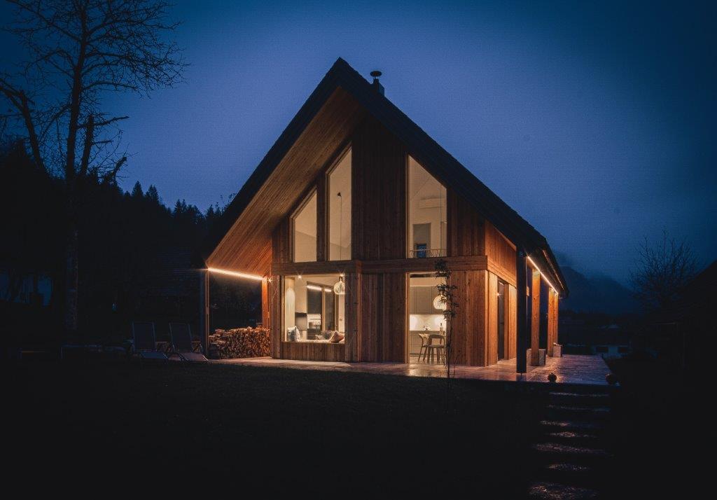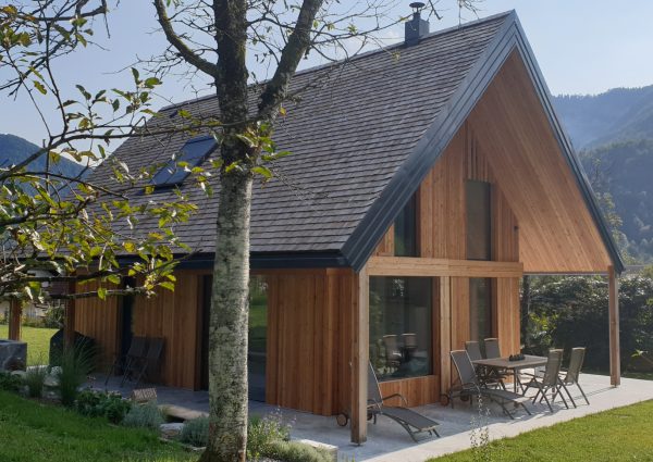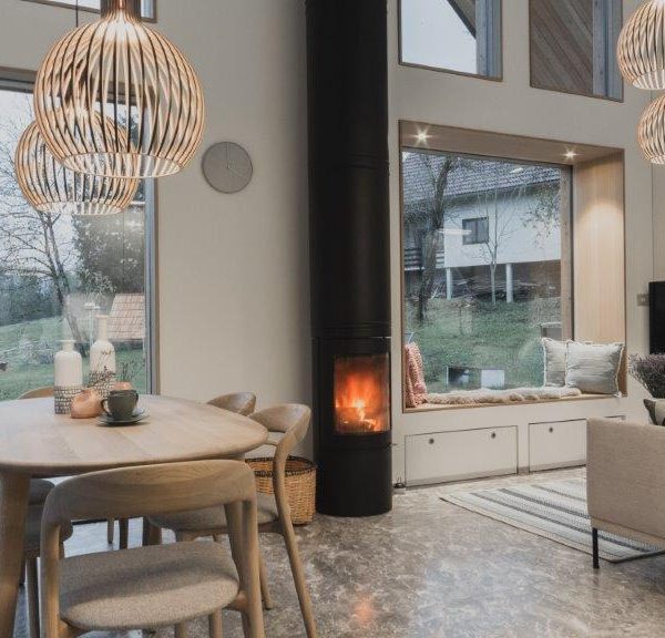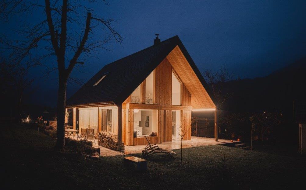 Dans le dialecte de Kostel, bale signifie “viens, viens”. Le nom de la maison vous invite au confort de la nature qui l’entoure. Elle est construite dans un style moderne, mais dans le respect du patrimoine culturel et architectural local. La toiture est constituée de bardeaux de mélèze à trois couches et la façade est ventilée par des lattes verticales en mélèze. Le bâtiment flotte au-dessus d’une base en pierre de marbre de Hotavlje. L’espace central ouvert, d’une hauteur de 7,5 m, offre une belle vue sur le mur de Kuželje. L’élément principal de l’espace central est une cheminée noire. À l’intérieur de la maison, le chêne massif est utilisé comme matériau de base. La table à manger, les chaises et la table club montrent le travail méticuleux des ébénistes, l’accent étant mis sur la force et la solidité du chêne. La maison est située dans la région de Kočevje. (Photo: Nik Grmovšek)