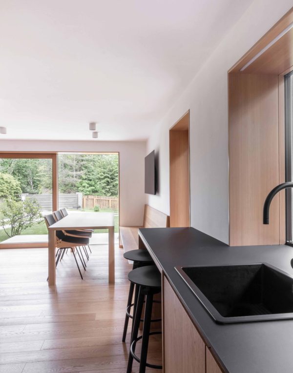 La maison, nichée dans la nature des forêts de Pohorje, a été construite dans les années 1990. Le bâtiment avait un plan compact, des pièces avec de petites ouvertures de fenêtre et un mobilier obsolète. L’investisseur souhaitait moderniser la maison, la relier à son environnement et la rapprocher de la vie moderne. La rénovation de la maison vise à relier l’espace de vie intérieur à l’environnement vert dans lequel la maison est située. La petite superficie de la maison, associée à une conception bien pensée, permet de vivre de manière luxueuse et confortable dans une maison qui possède juste ce qu’il faut pour répondre à tous les besoins. (Photo: Matic Škarabot)